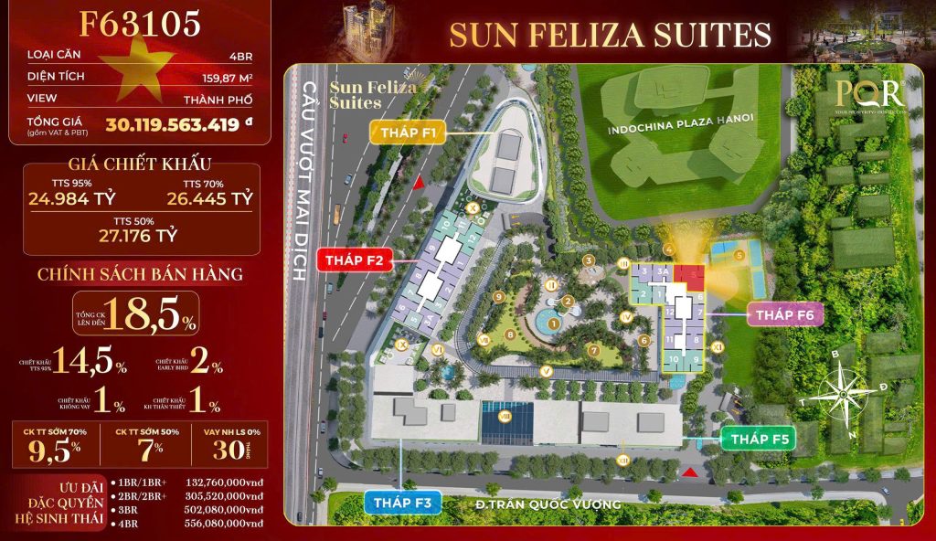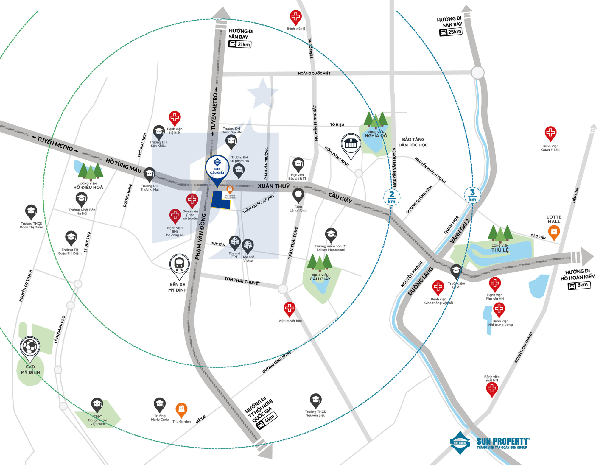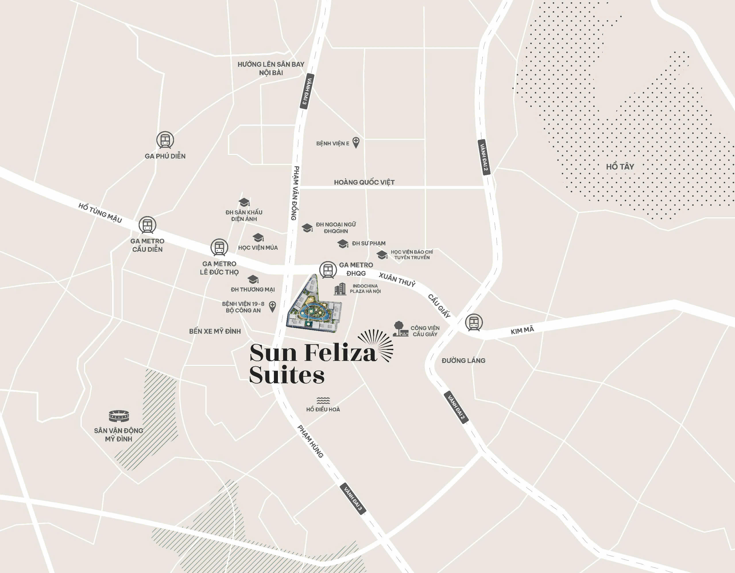 Sun Feliza Suites Cầu Giấy tọa lạc tại vị trí “kim cương” giữa trung tâm Hà Nội, nơi giao thoa của các tuyến đường huyết mạch Phạm Hùng và Xuân Thủy. Dự án nằm gần Indochina Plaza, kết nối trực tiếp với cầu vượt Mai Dịch, đường Trần Quốc Vượng và đường Xuân Thủy, mang đến sự thuận tiện tối đa trong di chuyển và tiếp cận các tiện ích hàng đầu.